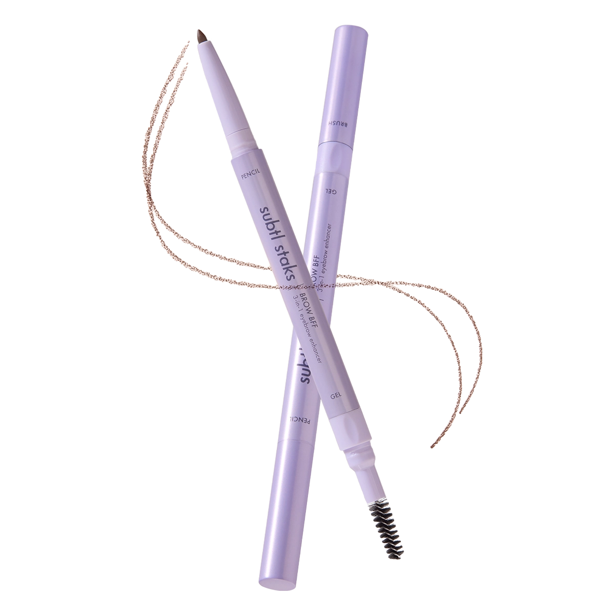 This revolutionary 3-in-1 eyebrow enhancer includes a spoolie brush, a pencil, and a clear gel.